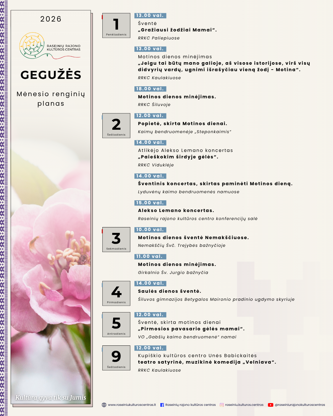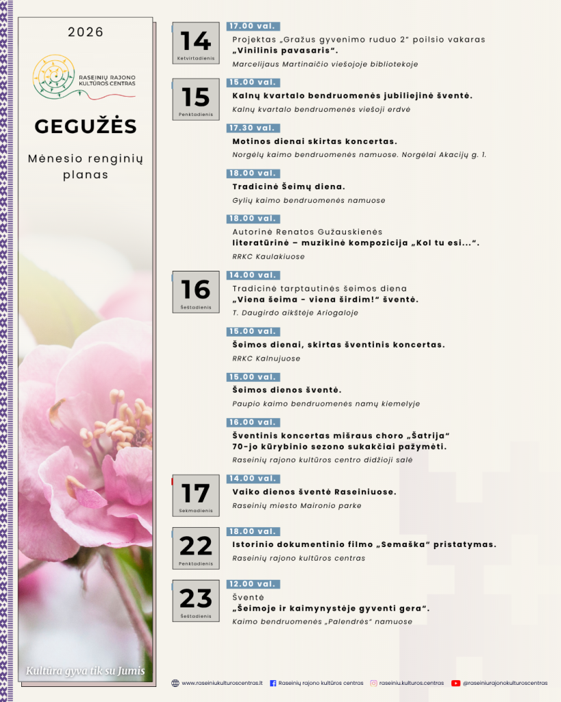 Gegužės mėnesį pradėsime nuo ypatingo minėjimo – Motinos dienos. Visame rajone vyks įvairaus pobūdžio renginiai, skirti svarbiausiam žmogui pasaulyje – Mamai. Šį mėnesį netrūks pramoginių koncertų, spektaklių ir kino seansų, taip pat minėsime Šeimos ir vaiko dieną.