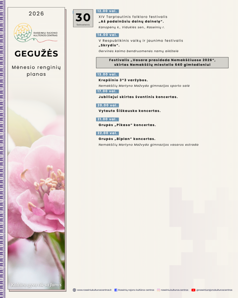 Gegužę vainikuos net trys jubiliejiniai festivaliai: Nemakščių 640 metų jubiliejaus šventė „Vasara prasideda Nemakščiuose 2026“, V respublikinis vaikų ir jaunimo festivalis „Skrydis“ ir XIV folkloro festivalis „Aš padainūsiu dainų dainelę“, skirtas folkloro ansamblio „Degule“ 30-mečiui paminėti.