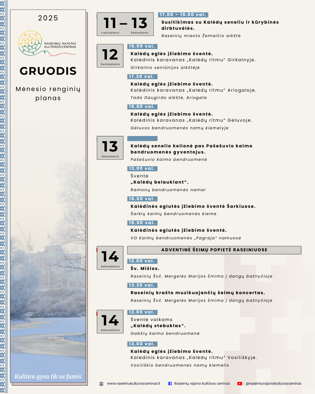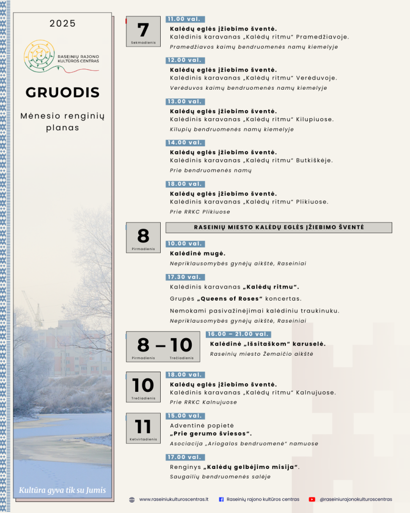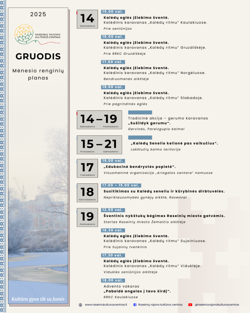 Artėjant didžiosioms metų šventėms, Raseinių rajono kultūros centras kviečia visus drauge kurti šventinę nuotaiką, leisti laiką su šeima, bičiuliais ir bendruomenėmis bei pasinerti į jaukų žiemos kultūros ritmą.