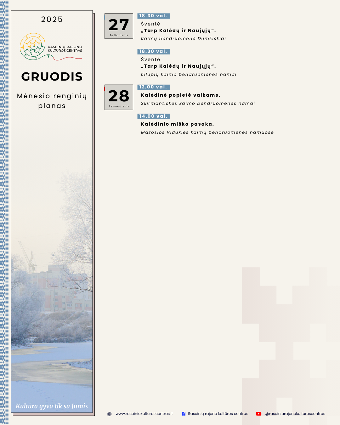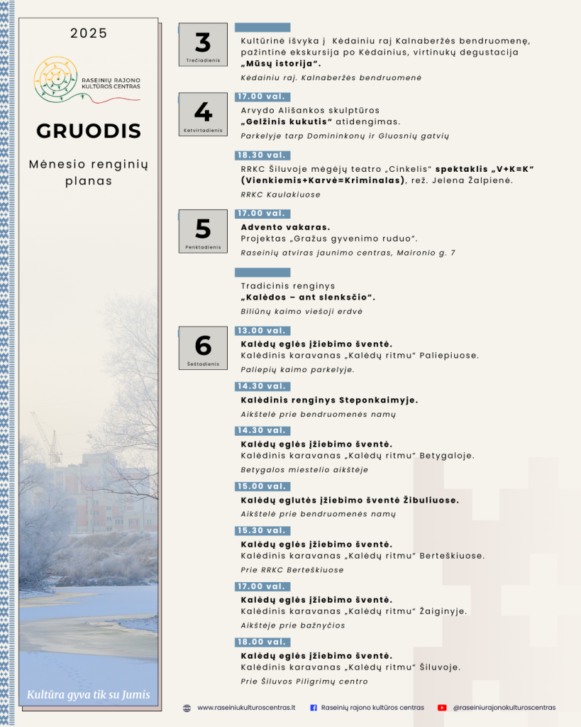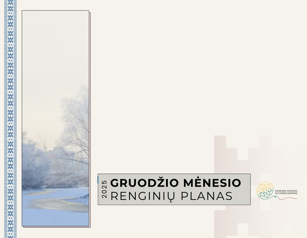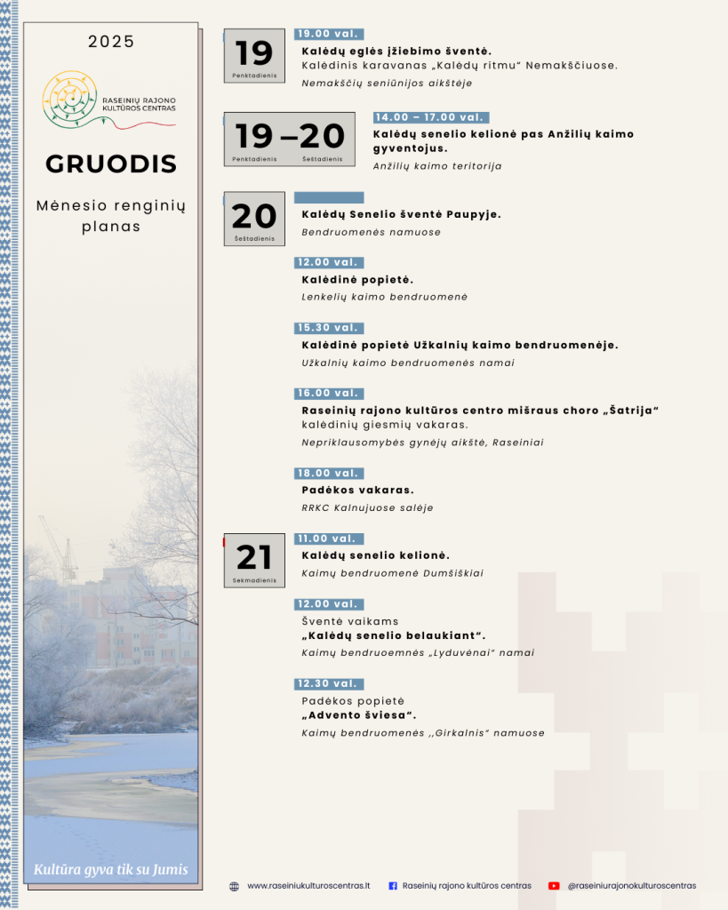 Artėjant didžiosioms metų šventėms, Raseinių rajono kultūros centras kviečia visus drauge kurti šventinę nuotaiką, leisti laiką su šeima, bičiuliais ir bendruomenėmis bei pasinerti į jaukų žiemos kultūros ritmą.