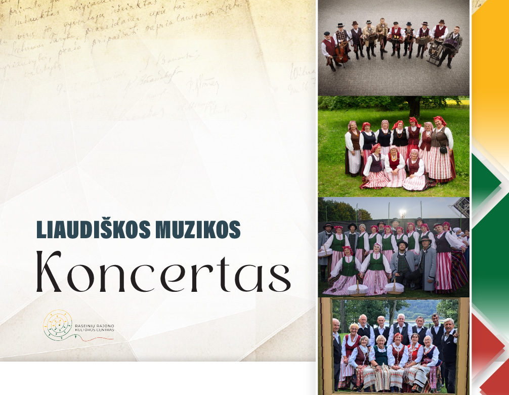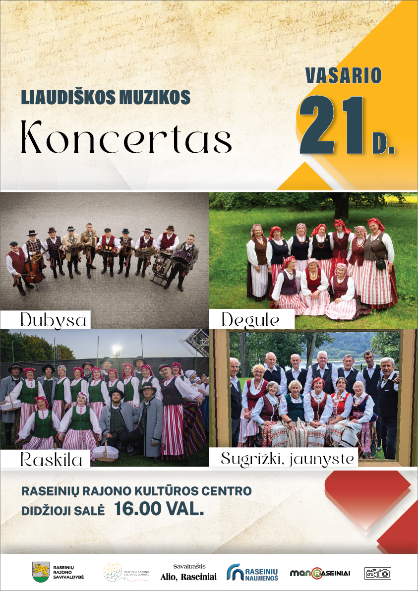 Vakare skambės lietuvių liaudies muzikos melodijos ir šokiai, kviečiantys patirti gyvąsias tradicijas ir bendrystės nuotaiką. Koncerte dalyvaus Raseinių rajono kultūros centro mėgėjų meno kolektyvai: tradicinės instrumentinės muzikos ansamblis „Dubysa“ (vad. Dainius Maslauskas), folkloro ansamblis „Degule“ (vad. Asta Nikžentaitienė), tautinių šokių kolektyvas „Raskila“ (vad. Milda Urniežienė) ir šokių kolektyvas „Sugrįžki, jaunyste“ (vad. Aušra Jukilaitienė).