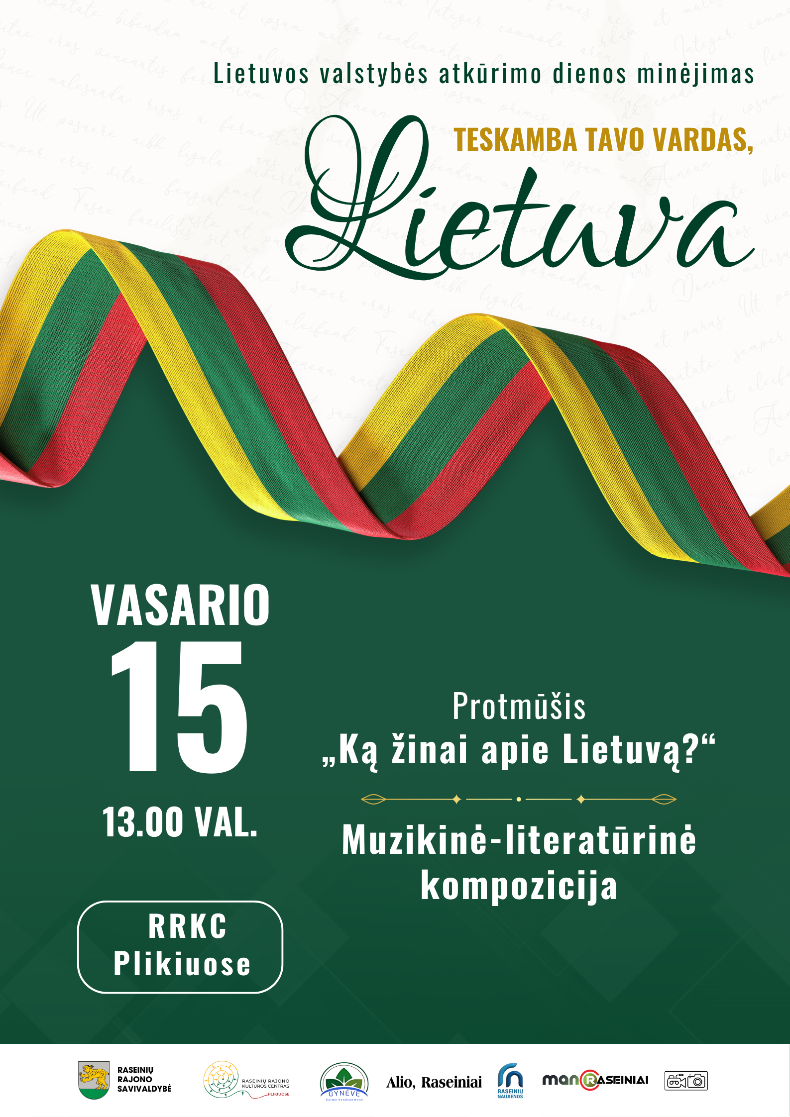 Vasario 15-ąją Plikiuose skambės Lietuva – gyva, mąstanti ir kurianti. Lietuvos valstybės atkūrimo dienos minėjimas kvies susiburti prasmingam laikui kartu, pasitikrinti žinias protmūšyje „Ką žinai apie Lietuvą?“ ir pasinerti į muzikinę-literatūrinę kompoziciją, kurioje susipins žodis, muzika ir tautinė atmintis. Tai popietė, skirta pasididžiavimui savo šalimi ir bendrystei.