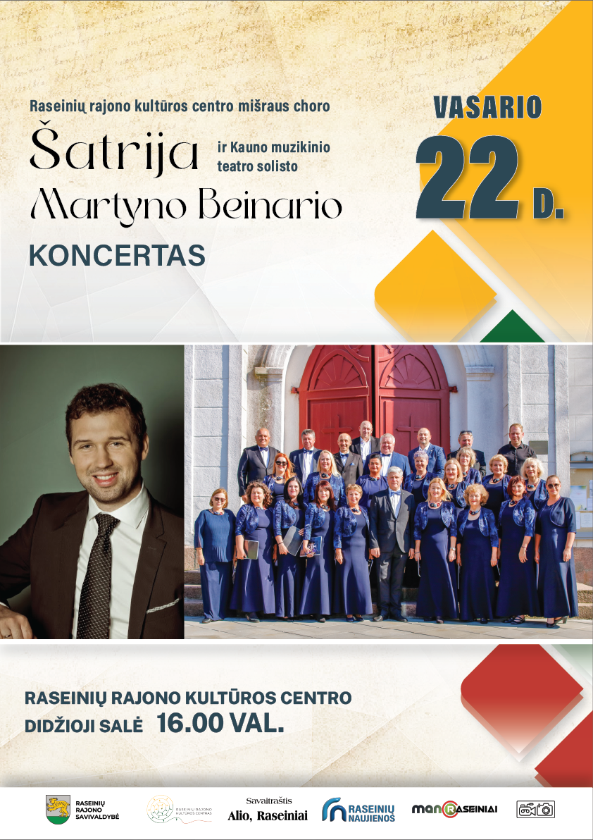 Finalinis Raseinių rajono kultūros centro atidarymo renginys suskambės aukšta nata. Jums koncertuos Raseinių rajono kultūros centro mišrus choras „Šatrija“ (vad. Gražvydas Jegnoras) ir Kauno muzikinio teatro solistas Martynas Beinaris. Kvies ateiti ir kartu pasimėgauti pasimėgauti profesionaliu atlikimu, skambiais balsais ir iškilminga muzikinio vakaro nuotaika.