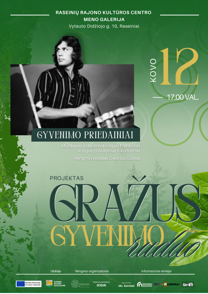 Kovo 12 d. vyks pirmasis projekto „Gražus gyvenimo ruduo“ pavasario renginys. Raseinių rajono kultūros centro meno galerijoje muzikanto ir dainininko Algio Frankonio knygos „Gyvenimo priedainiai“ pristatymas – koncertas.