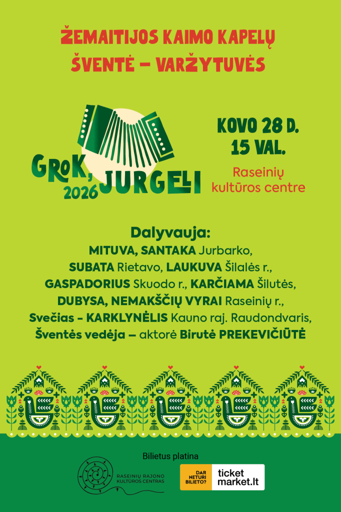 Po kelerių metų pertraukos kovo 28 dieną į Raseinių rajono kultūros centrą visus liaudiškos muzikos gerbėjus vėl pakvies Žemaitijos kaimo kapelų šventė – varžytuvės „Grok, Jurgeli“.